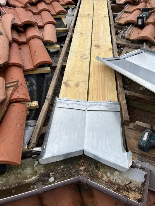 Réalisation sur mesure d une noue en zinc avec changement de la fonçure en bois ainsi qu un entourage de cheminée en zinc dans les landes à 40100 Dax....