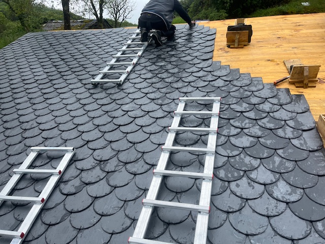 Chaque ardoise a été découpée et posée à la main, selon un calepinage étudié, assurant un alignement parfait et une étanchéité optimale.